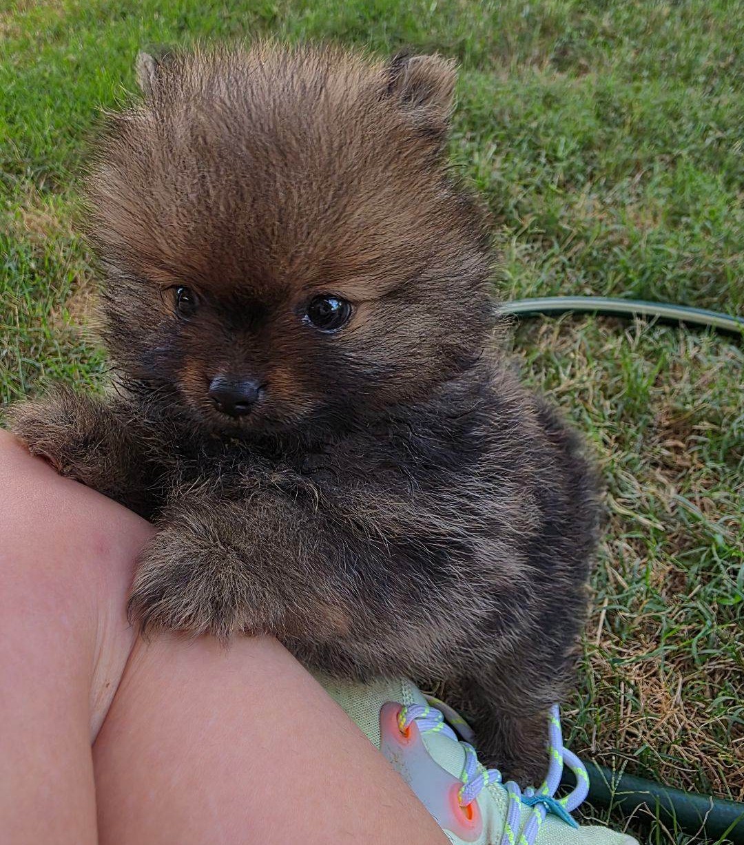 Meet Klen, our rare-coloured, purebred Teddy-Bear Face Pomeranian boy with a striking brindle coat that’s already showing depth, shading, and the promise of his father’s magnificent fluff. He is confident, sweet-natured, and follows you everywhere with his adorable little trot.